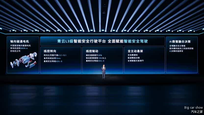 “天元智架”的核心在于两大技术模块:青云L3级智能安全平台与鲲鹏L3级智驾系统。前者通过轴向磁通电机、全主动悬架与线控底盘技术,将车身控制响应速度压缩至毫秒级;后者基于鲲鹏瞰视网络与九算大模型,构建动态环境感知能力,结合AI数据迭代机制提升系统冗余度。