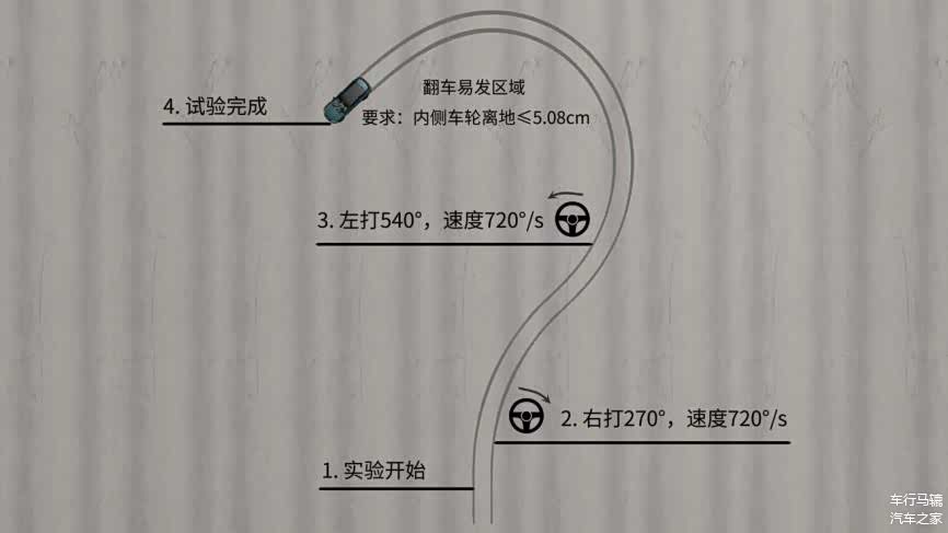 提起汽车操控方面的测试,很多朋友第一时间想到的是麋鹿测试,殊不知,在此之上的鱼钩测试更能检验车辆的抗侧翻能力,有着“死亡弯道”之称的它模拟的是高速避障急转向的驾驶情况,车辆需要以56km/h-80km/h的规定速度进入试验区域,迅速向车辆一侧急转270°,在2秒内当车辆达到最大侧倾角时,再迅速反向将方向盘急转540°。