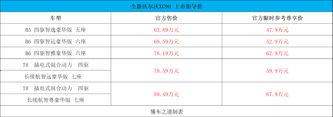 【懂车之道 产品】近日,懂车之道获悉,沃尔沃全新XC90正式发布上市,官方售价区间为63.89-89.49万元,限时参考尊享价47.9-67.9万元。新车提供5/6/7座车型可供选择。动力方面,提供燃油以及插混动力供消费者选择。下面,和大家一起来看看新车的产品力如何?