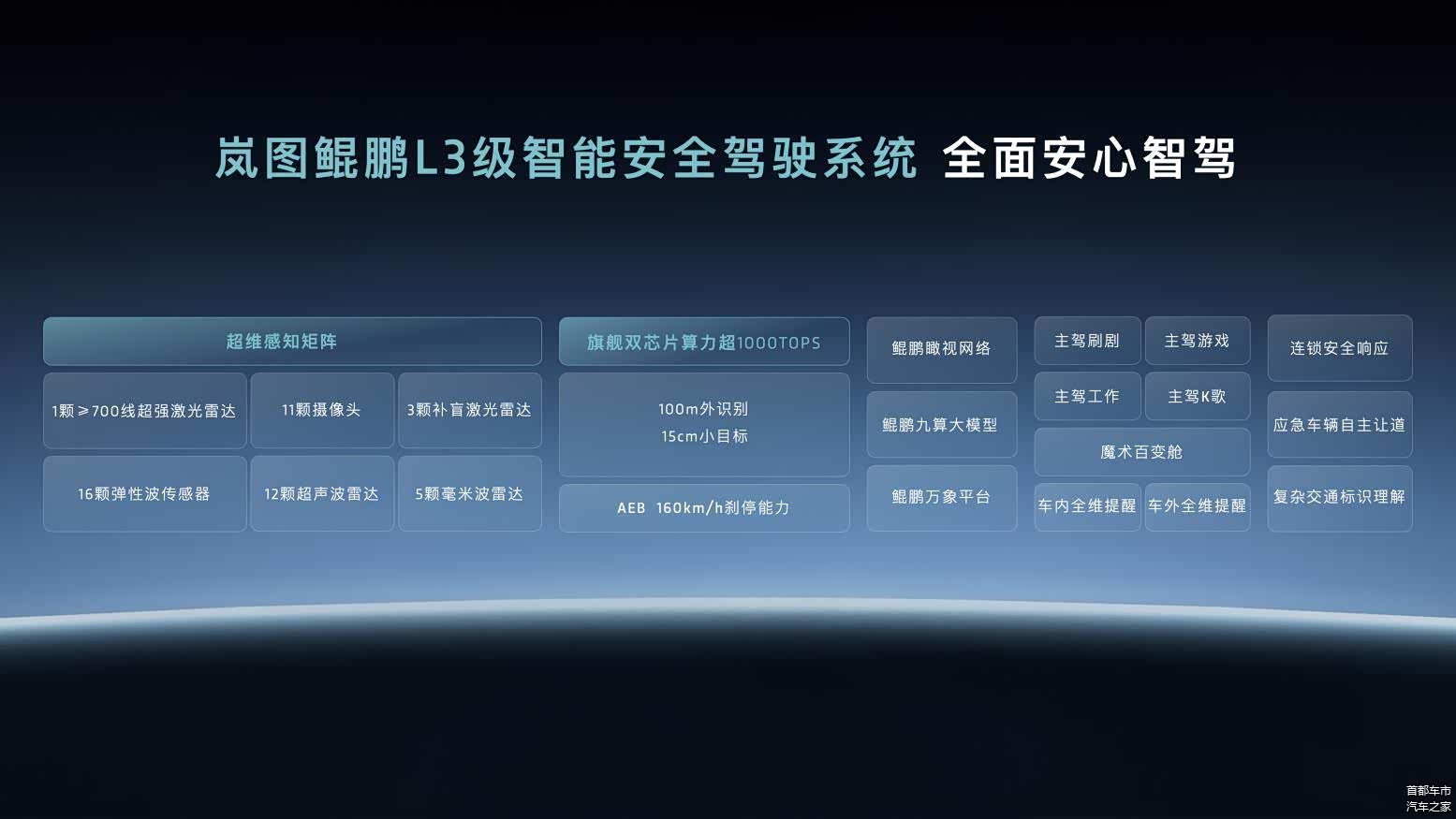 发布会上,岚图还宣布其首款全尺寸大六座SUV车型将于2025年内正式发布,车型项目代号“泰山”,定位为“时代科技旗舰”。这款新车将是天元智架首款新品,将首发搭载青云L3级智能安全行驶平台,并配备鲲鹏L3级智能安全驾驶系统,拥有超强感知系统、顶级算力、极致安全。