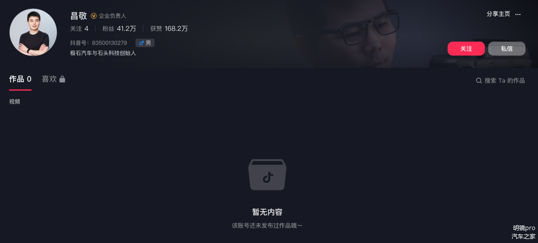 4月16日,石头科技、极石汽车创始人昌敬突然清空其抖音、微博、视频号等账号的所有内容引发热议。通过查询发现,截至目前,昌敬在抖音有41.2万粉丝,在微博有1.1万粉丝。在车企高管纷纷下场打造个人IP、加强与用户链接的背景下,昌敬的这一反常举动引发外界对其个人动向及公司经营状况的猜测。