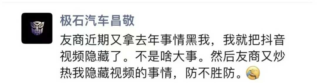 当天晚些时候,昌敬在个人朋友圈进行解释。“友商近期又拿去年事情黑我,我就把抖音视频隐藏了。不是啥大事。然后友商又炒热我隐藏视频的事情,防不胜防。”昌敬说道。这里说的“去年事情”,可能是指“套现近8亿却劝投资者冷静一事”,这在当时引起广泛的讨论。