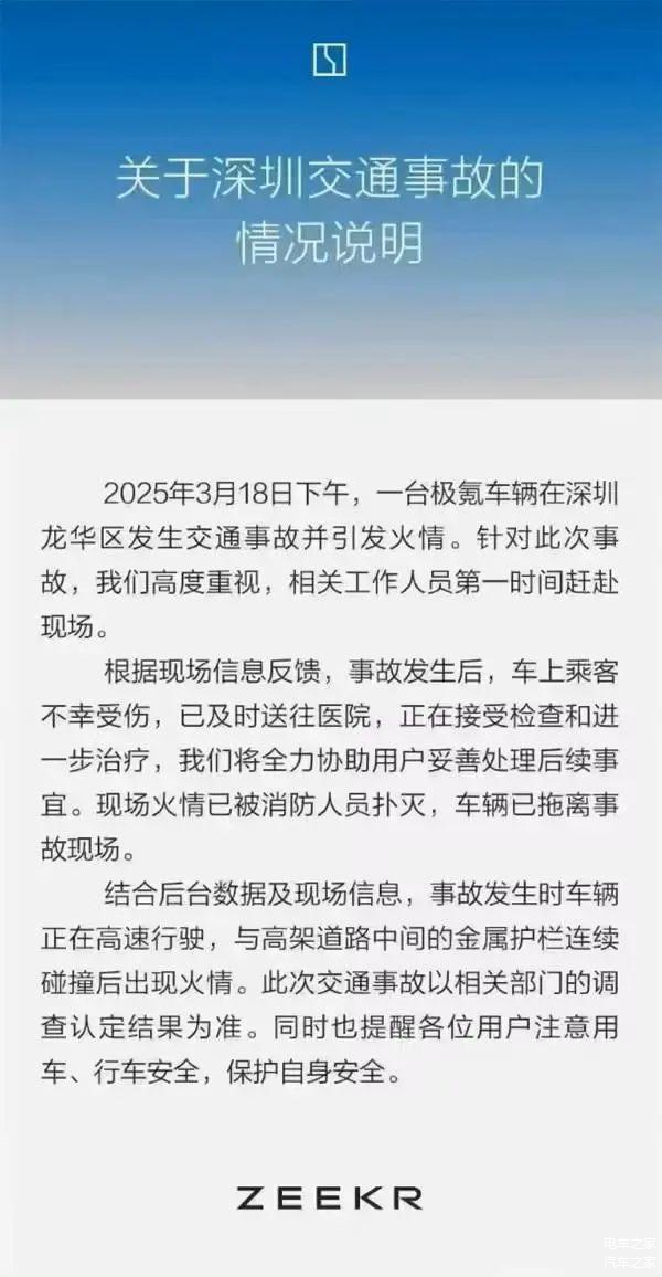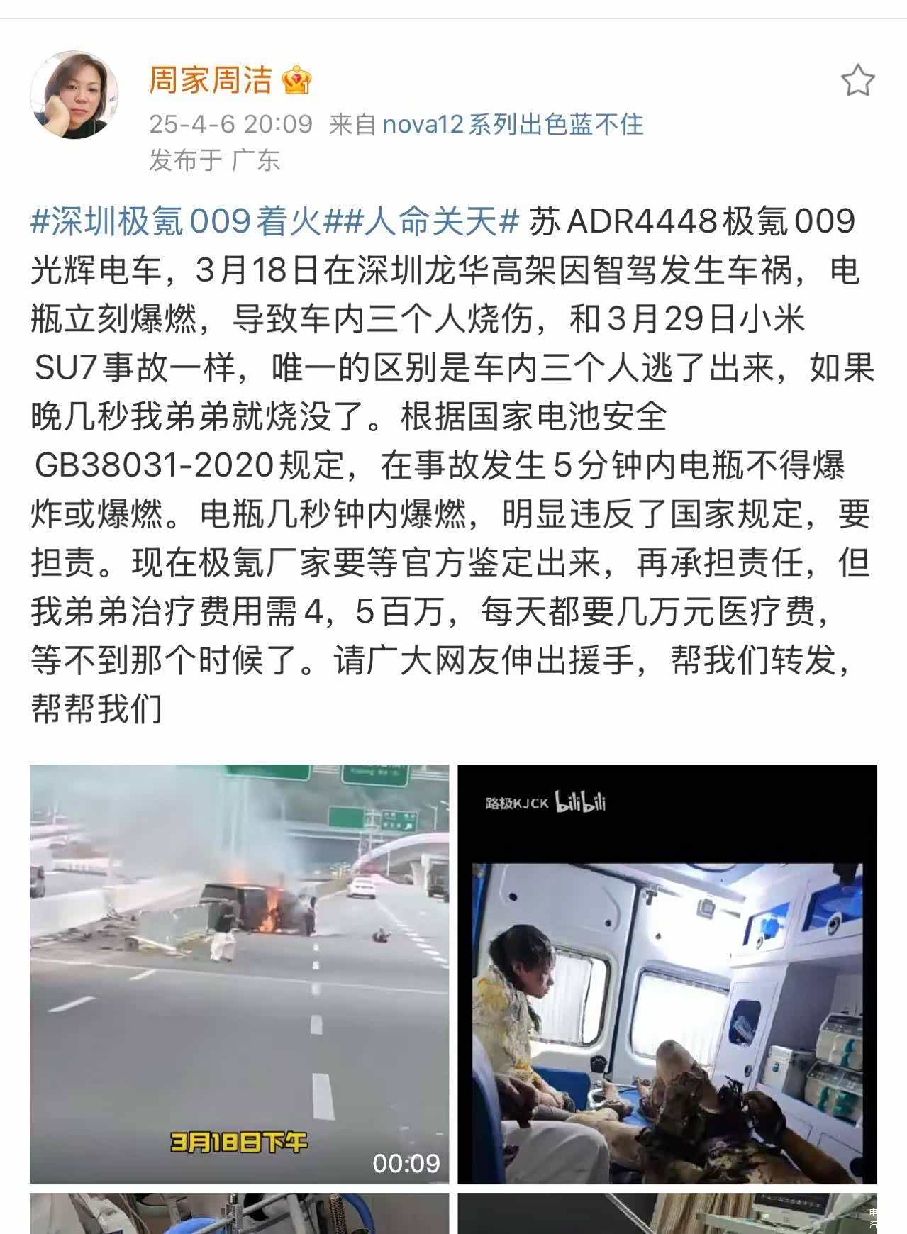 4月6日一名自称为深圳极氪009着火事件车主姐姐的微博账号发布消息,该账号表示,深圳极氪009着火,人命关天,车牌号为苏ADR4448极氪009光辉电车,3月18日在深圳龙华高架因智驾发生车祸,电瓶立刻爆燃,导致车内三个人烧伤,和3月29日小米SU7事故一样,唯一的区别是车内三个人逃了出来,如果晚几秒我弟弟就烧没了。根据国家电池安全GB38031-2020规定,在事故发生5分钟内电瓶不得爆炸或爆燃。电瓶几秒钟内爆燃,明显违反了国家规定,要担责。现在极氪厂家要等官方鉴定出来,再承担责任,但我弟弟治疗费用需4,5百万,每天都要几万元医疗费,等不到那个时候了。请广大网友伸出援手,帮我们转发,帮帮我们。