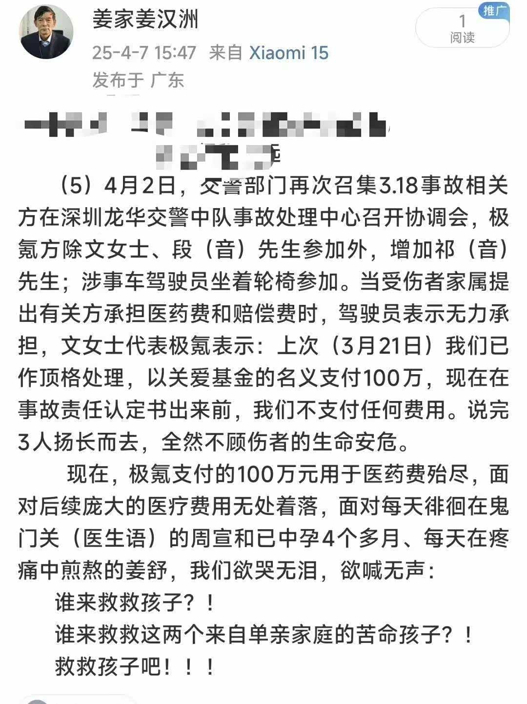 4月7日一位自称是深圳极氪009着火事件车主岳父的账号发布消息,他在微博中表述,4月2日,交誉部门再次召集3.18事故相关方在深圳龙华交警中队事故处理中心召开协调会,极氪方除文女士、段(音)先生参加外,增加祁(音)先生;涉事车驾驶员坐着轮椅参加。当受伤者家属提出有关方承担医药费和赔偿费时,驾驶员表示无力承担,文女士代表极氪表示:上次(3月21日)我们已作顶格处理,以关爱基金的名义支付100万,现在在事故责任认定书出来前,我们不支付任何费用。说完了人扬长而去,全然不顾伤者的生命安危。