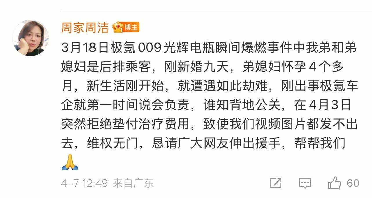 紧接着该账号第二日再次发布消息表示,3月18日极氪009光辉电瓶瞬间爆燃事件中我弟和弟媳妇是后排乘客,刚新婚九天,弟媳妇怀孕4个多月,新生活刚开始,就遭遇如此劫难,刚出事极氪车企就第一时间说会负责,谁知背地公关,在4月3日突然拒绝垫付治疗费用,致使我们视频图片都发不出去,维权无门,恳请广大网友伸出援手,帮帮我们。