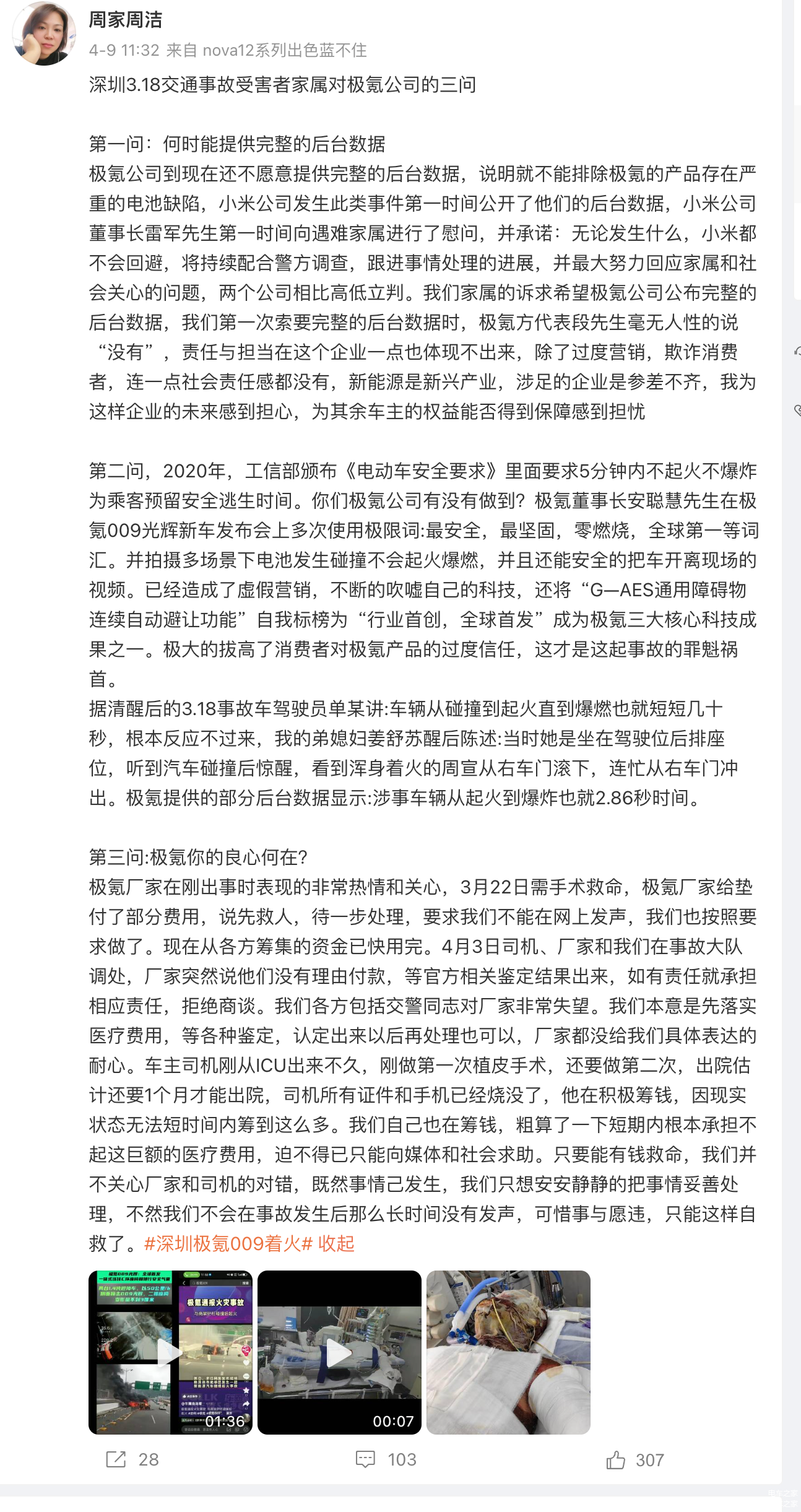 第一问,何时能提供完整的后台数据。第二问,就是工信部颁布《电动车安全要求》里面要求5分钟内不起火不爆炸为乘客预留安全逃生时间。极氪董事长安聪慧先生在极氪009光辉新车发布会上多次使用极限词:最安全,最坚固,零燃烧,全球第一等词汇。存在虚假营销。第三点,就是表示极氪不负责,3月22日需手术救命,极氪厂家给垫付了部分费用,说先救人,待一步处理,要求我们不能在网上发声,我们也按照要求做了。现在从各方筹集的资金已快用完。4月3日司机、厂家和我们在事故大队调处,厂家突然说他们没有理由付款,等官方相关鉴定结果出来,如有责任就承担相应责任,拒绝商谈。