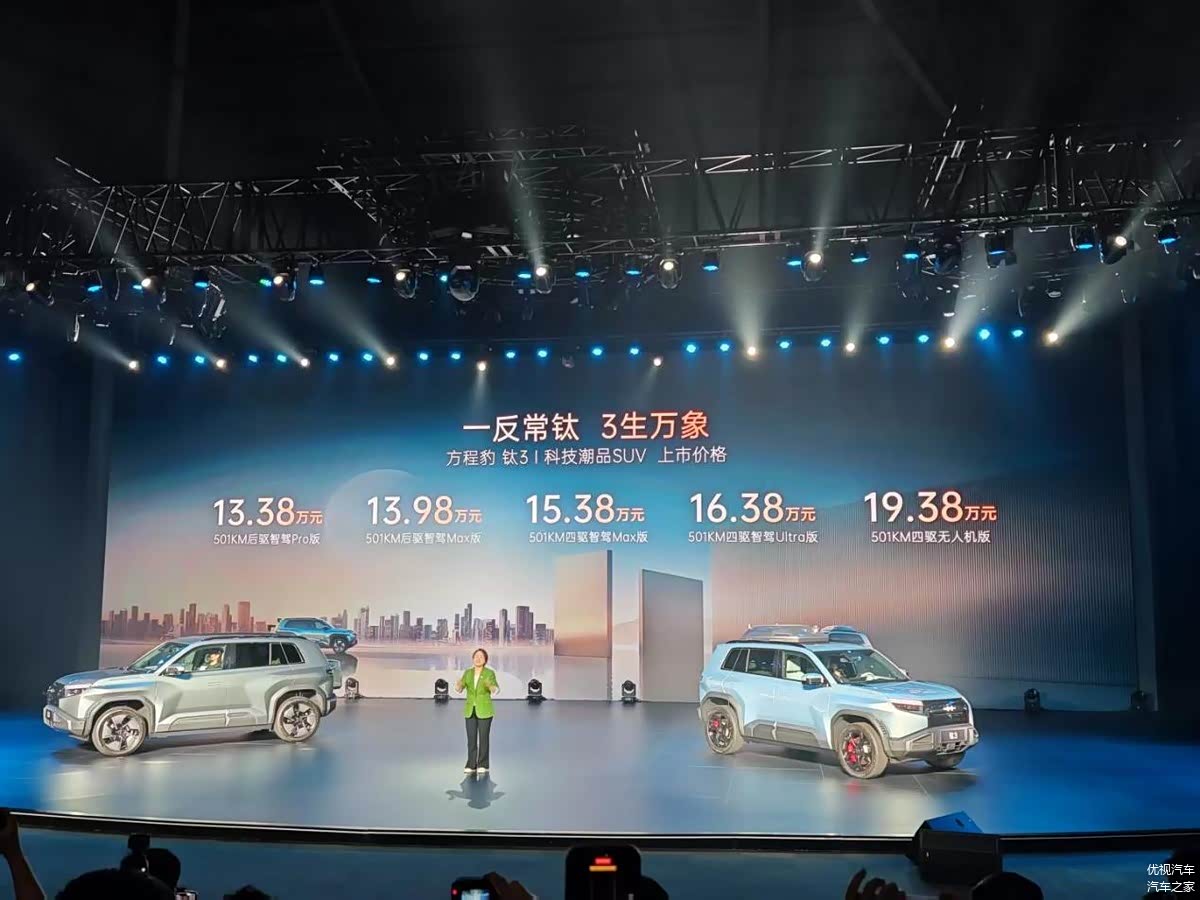 比亚迪旗下个性化品牌方程豹首款杀入20万元以内市场的SUV—— 钛3(图片 | 参数 | 询价),在4月16日正式上市。新车共推出5个版本,官方指导价区间为13.38万至19.38万元,并提供金融贴息、置换补贴等多项购车政策。