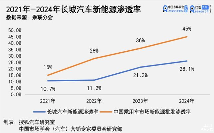 而魏建军的个人理念始终凌驾于企业战略层面,先是“宁可少卖车也不亏钱”,再是“掉出前10也无所谓”。2024年通过砍掉亏损车型、聚焦高端市场,虽推高单车利润,但牺牲了市场份额,利润至上的反噬来的奇快无比。市场新能源渗透率只增不减,这对于品牌新能源渗透率极低的长城来说是一个没剩多久的定时炸弹。