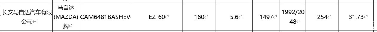 马自达EZ-60采用的是增程动力,不过他的增程系统跟马自达EZ-6有点不一样,他的增程器就是全新的1.5L增程器,型号为CM469NE1,这是长安马自达发动机有限公司的增程器,就是长安马自达自家的,最大功率72kW,电机功率工信部披露了:190kW,电池容量则为31.73kWh,工信部纯电续航160km,馈电油耗百公里5.6L。