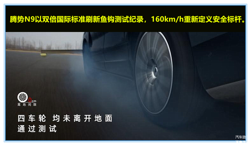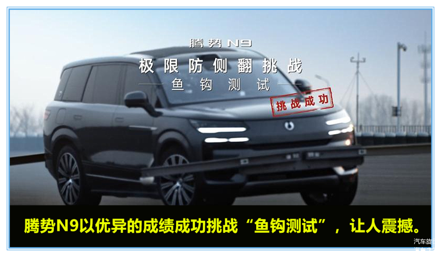 为了证明自己的的安全性表现,腾势N9更是敢于向检验车辆操控极限的终极挑战“鱼钩测试”发起冲击,作为一款车长5.25米,高2.03米,整车质量达3吨多的大型全尺寸SUV,腾势N9的挑战面临更大的压力,但是它为了证明自身实力,挑战超过两倍国际标准(80km/h)的速度,以180km/h时速通过鱼钩测试,创造新的全球记录。而且在测试中,腾势N9还做到了四轮完全不离地,可见180km/h还不是腾势N9鱼钩测试的极限速度。这一极限成绩充分证明了腾势N9的极致操稳性能,可以说它重新定义了大型SUV的安全新高度。