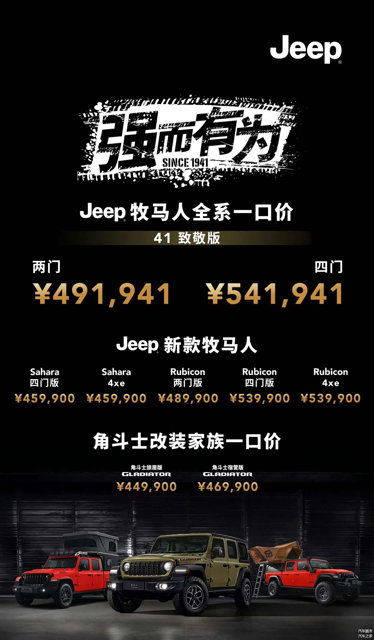 好在“一口价”的风,终于还是吹到了Jeep。4月9日,Jeep牧马人41致敬版正式发售,一共两款车型,一口价49.19万-54.19万元,而它们的原价分别是53.19万-58.19万元,也就是说,Jeep牧马人41致敬版直接给消费者让利4万元,而且不加条件,不设门槛,没有套路。