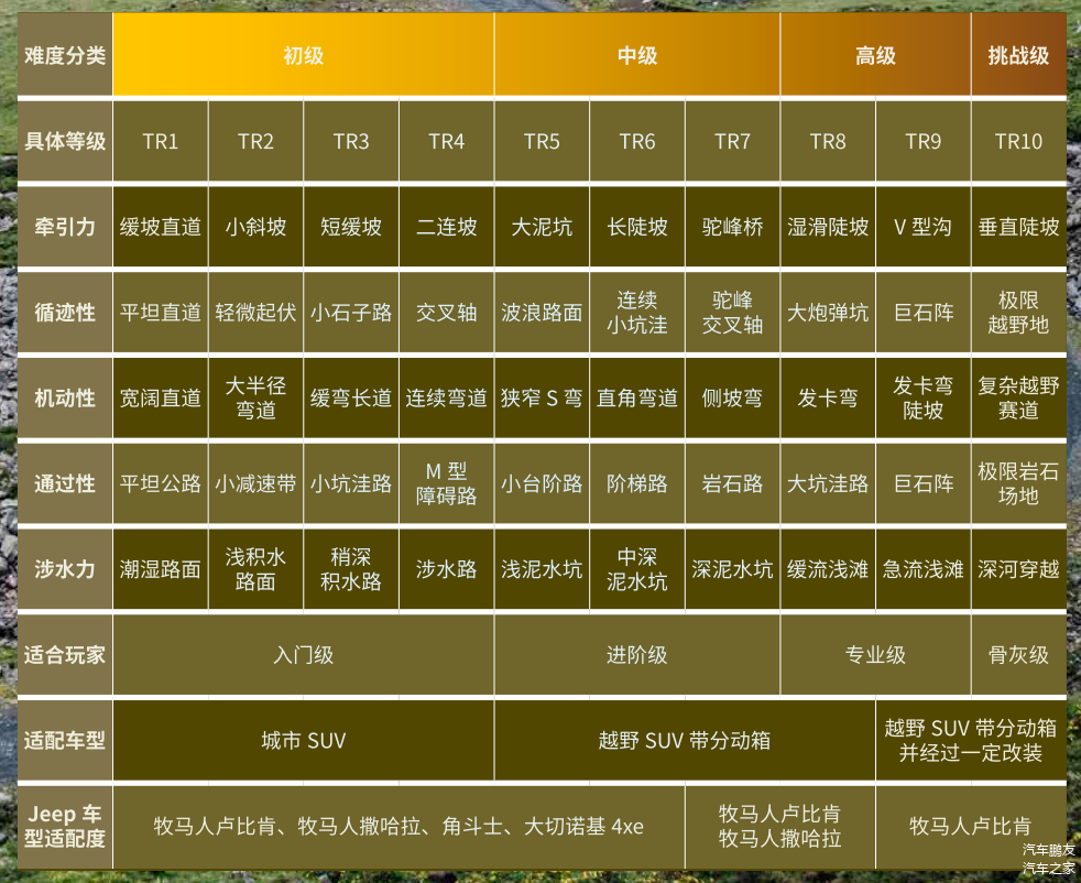 实际上,在Jeep品牌特有的Trail Rated评级体系,牧马人就表现不俗,该体系基于牵引力、循迹性、机动性、通过性和涉水力五大核心维度,来评定旗下四驱车型的越野性能水平,从TR1至TR10共分为10个级别,其中10级为最高等级,代表着车型在越野性能上的顶级实力。其中1-4级路况属于初级难度,满足基础越野需求,适合入门级玩家;5-7级路况属于中级难度,其更具挑战性的地形,适合进阶玩家;8-9级路况属于高级难度,其高难度的越野场景,适合专业级玩家;而10级路况则属于挑战级难度,其极限的环境,建议骨灰级玩家方可尝试。