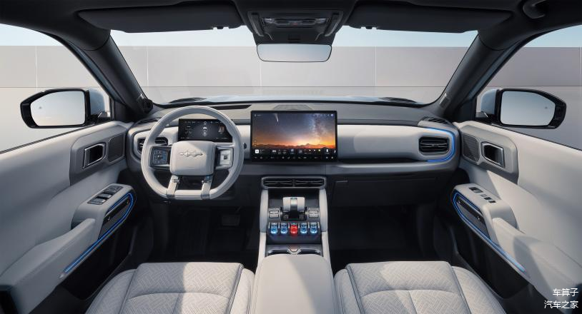 内饰则是延续了品牌的当下的基础调性,在契合外观硬朗元素的同时增加一些提升科技感的设计,有星云灰和深空黑两种配色可选。特别是档把区域还是很有方程豹的品牌特色,但是仪表盘的设计就很比亚迪了。车内还配备压缩机冷暖冰箱,支持-6-6°C、35-50°C调节。此外车内还配备帝瓦雷音响、车载KTV麦克风、车载手电筒、副驾自定义按键、星环氛围灯、多功能灵动岛等配置。