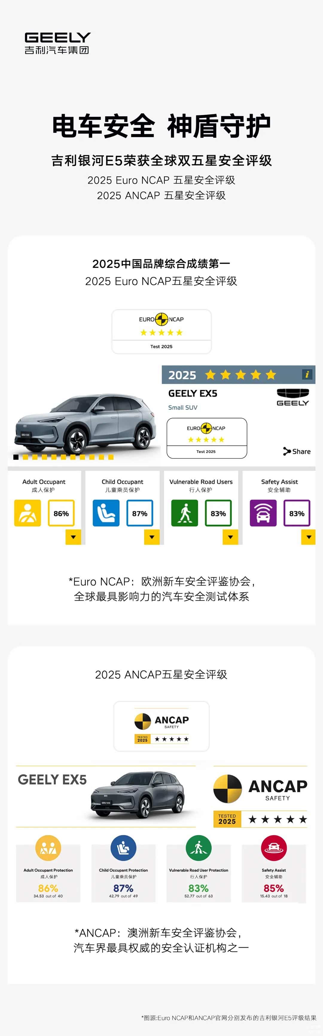 虽然银河E5所完成的50km/h正面中心柱碰挑战在行业内算是顶级难度,但如果了解吉利,就会发现这并不算太意外。因为在此之前,银河E5已经荣获了Euro NCAP与ANCAP全球双五星安全最高评级。