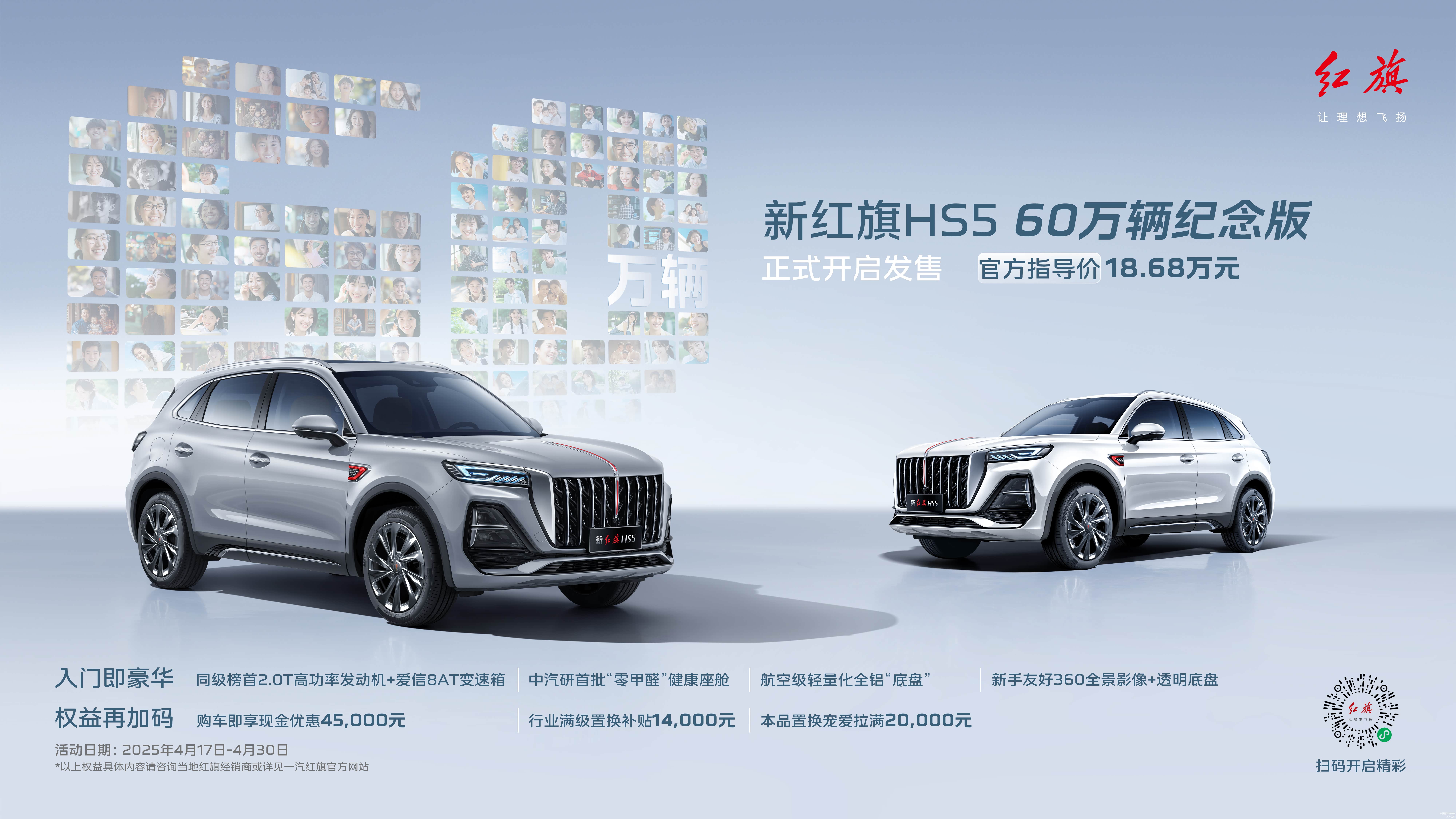 新红旗HS5 60万辆纪念版官方指导价18.68万元。在购买权益上,以现在的政策来看,它从4月17日至4月30日购车即可享受4.5万元的现金优惠,行业满级补贴1.4万元以及本品置换2万元补贴,绝对的诚意满满。