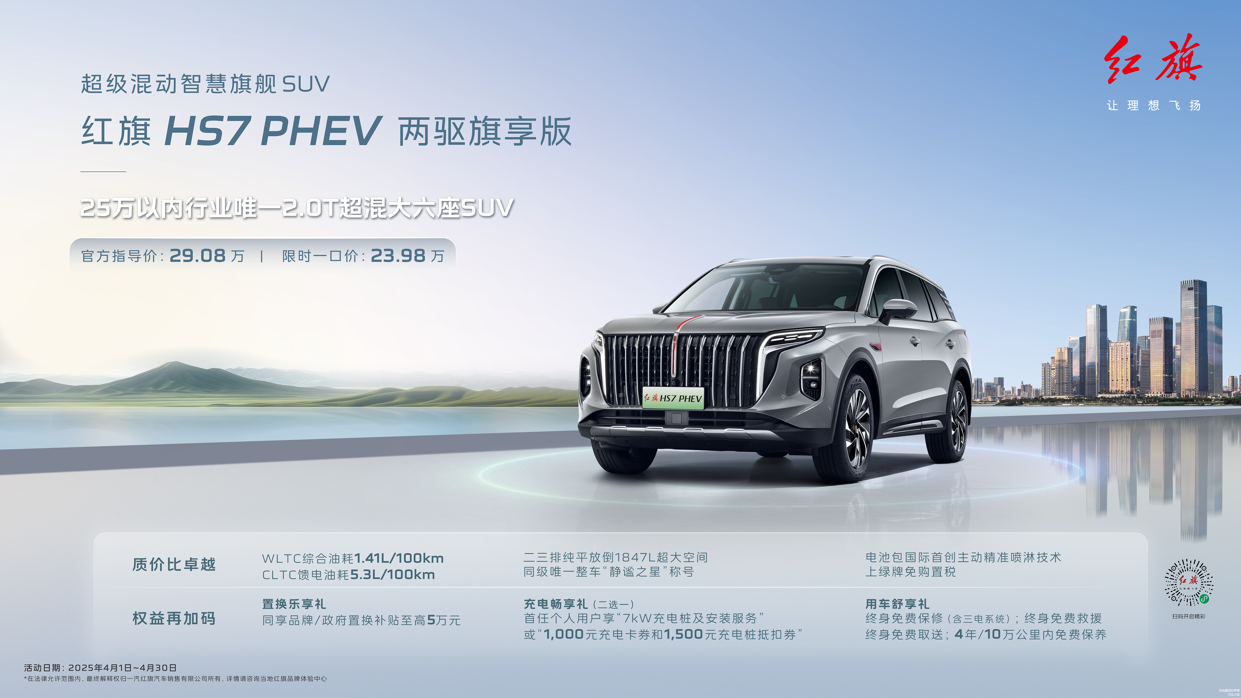 而与红旗HS5一样,红旗HS7 PHEV现在也有着很厉害的购买权益。两驱旗享版限时一口价23.98万元,同时享受至高5万元的置换补贴,还有1000元充电卡券和1500元充电桩抵扣券或7千瓦充电桩级安装服务(二选一),此外它还拥有终身免费救援、终身免费保修(含三电系统)、终身免费取送车和4年/10万公里内免费保证。可以说这样的权益足够丰富。