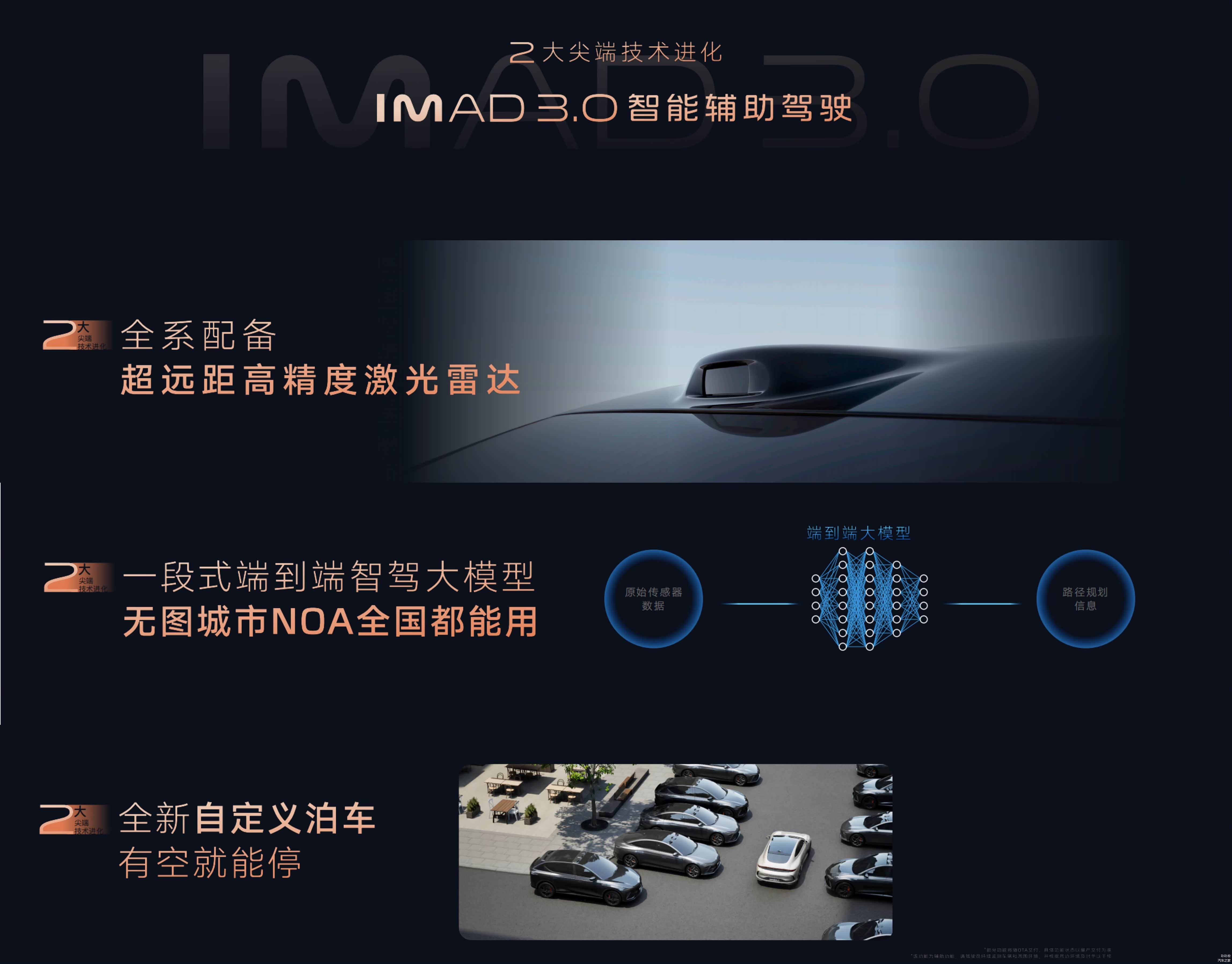 3、IMAD智能辅助驾驶3.0、满血版momenta,无图城市NOA全国可用,泊车方面有个可以自定义泊车,不需要有停车线,可以自己定义。一键AI代驾,