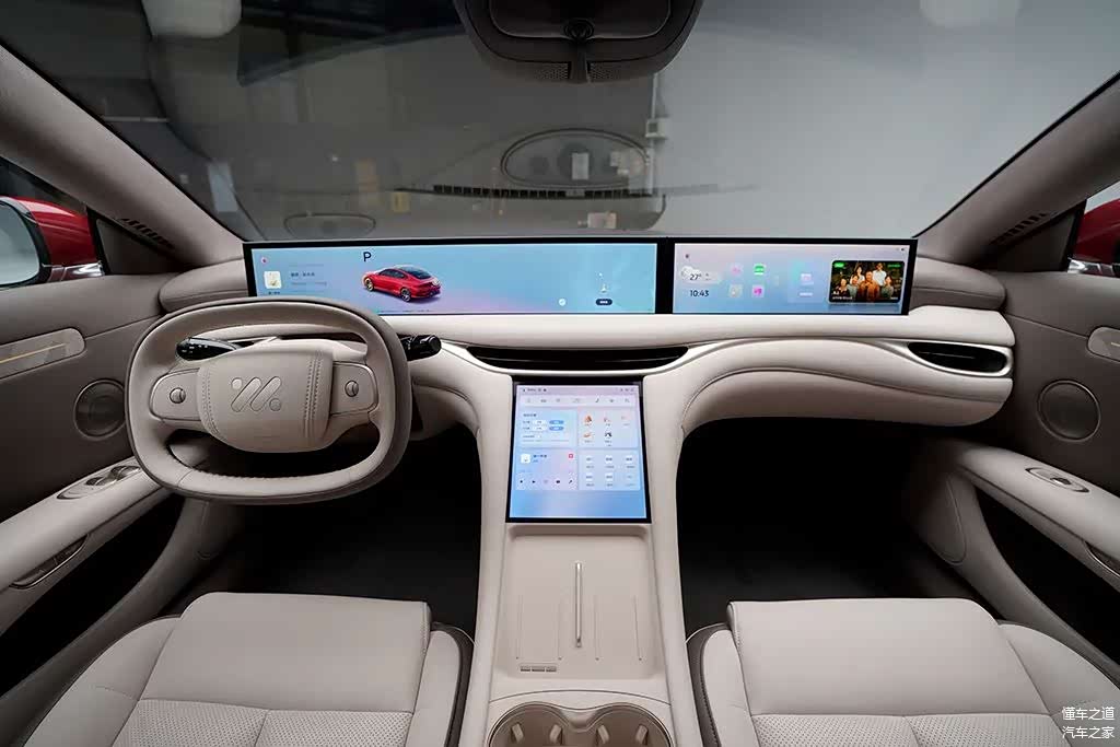 内饰方面,智己家族化的设计风格,联合中央圣马丁定制了全新的丝绒轻羽木纹饰板,怀挡设计、采用了椭圆形全辐的造型方向盘设计、椭圆形的空调出风口造型。采用了前后排256色氛围灯以及多元艺术纤维花纱顶棚。