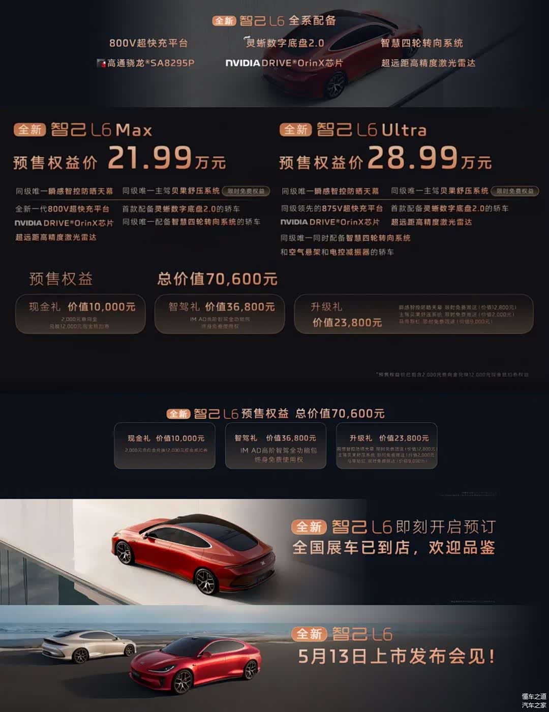 【懂车之道产品】近日,懂车之道获悉,全新 智己L6(图片 | 参数 | 询价)开始预售,推出2款车型,预售价22.99-29.99万元,预售权益价区间为21.99-28.99万元,据悉,新车将于5月13日上市。