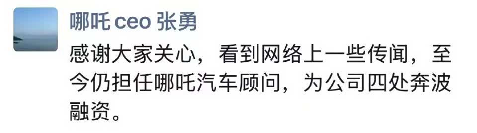 对此,张勇在4月14日在朋友圈进行回应。其表示:“看到网络上一些传闻,至今仍担任哪吒汽车顾问,为公司四处奔波融资。”