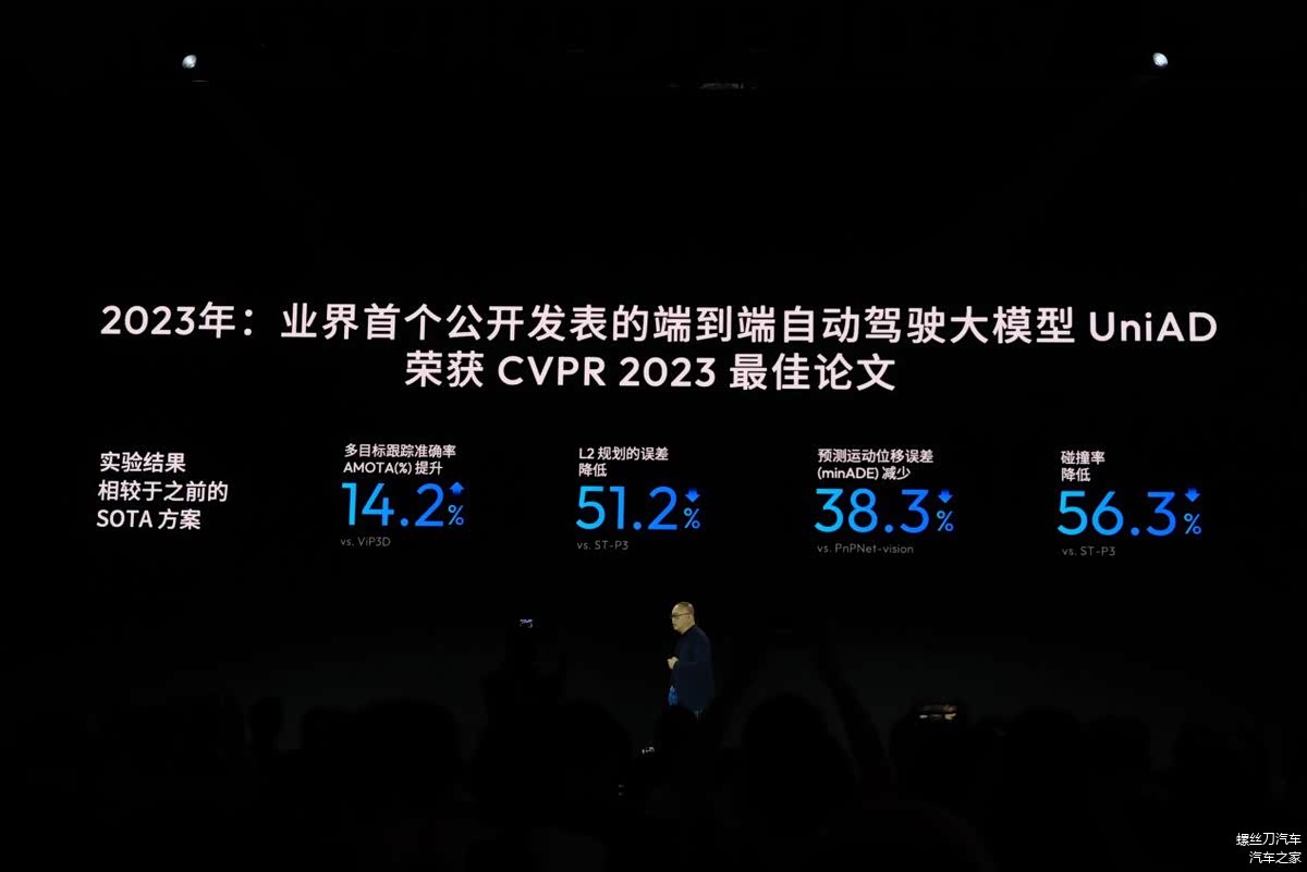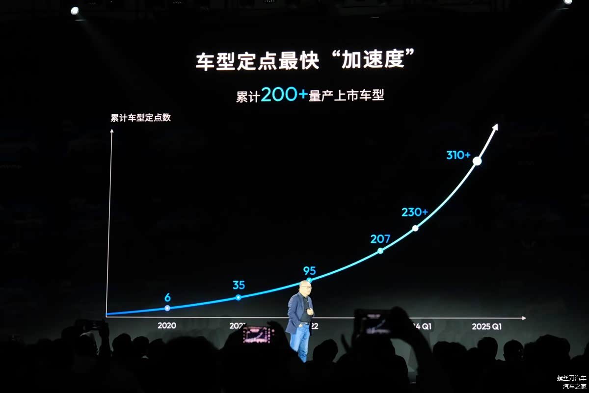 发布会现场,创始人:余凯 通篇都在脱稿演讲地平线历年来的学术研究成果及发展履历。从品牌2015年创立以来,几经周折最终确定在汽车智驾领域建树发扬光大,第一款选择地平线辅助驾驶的车型已是2020年,从第一年的6款车,短短5年时间,地平线已经为200+款车型提供了智驾方案。到今年第一季度截止,地平线的客户已经拓展到了310+款车型。