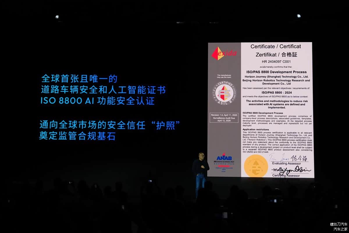 另外,地平线还展示了全球唯一一张“道路车辆安全和人工智能证书——ISO 8800 AI功能安全认证”,这张证书代表着地平线的智驾能力已经得到了国际认证。所以,未来地平线智驾将不仅仅限制于国内市场,面对不同国家的法规和路况,地平线也在持续建设当中。