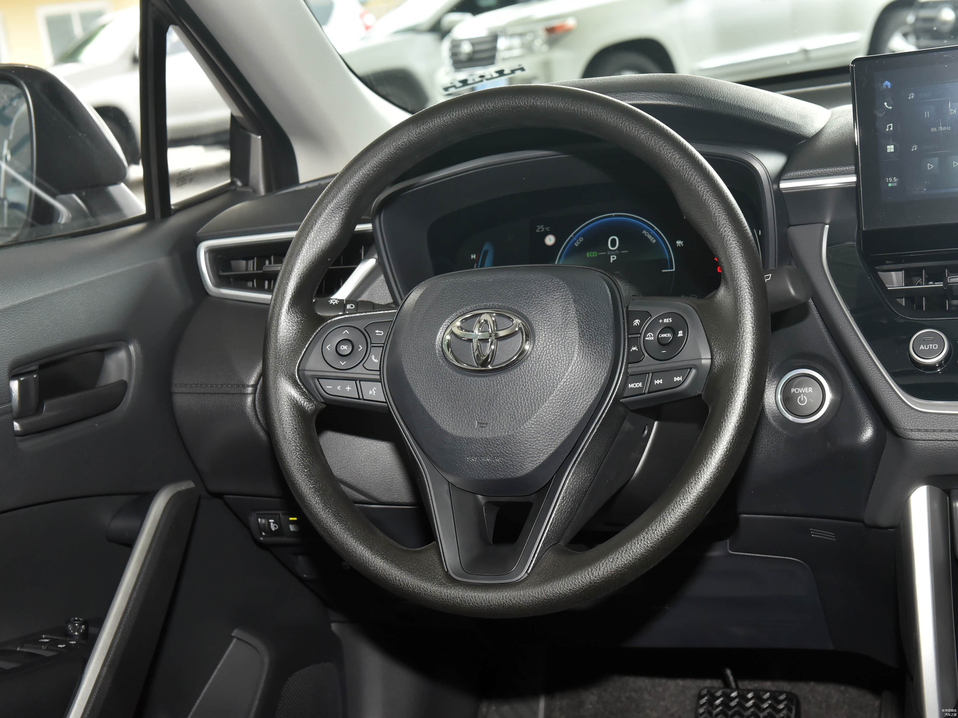 方向盘是丰田家族传统的三幅样式,除了旗舰版采用真皮包裹外,其他车型均采用了塑料材质的多功能方向盘,这一点说实话丰田有些抠门了。