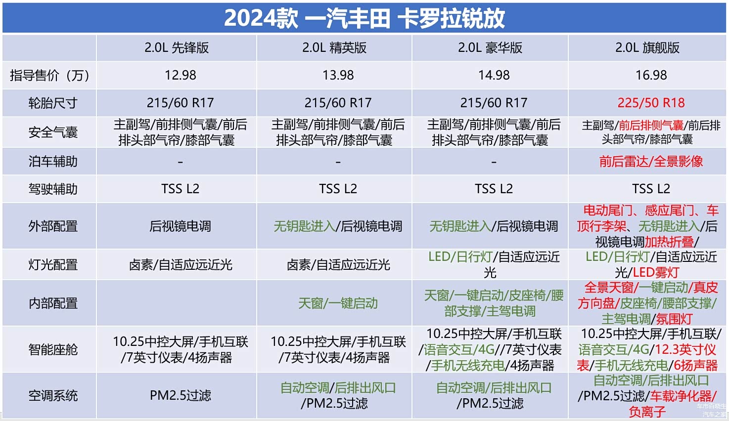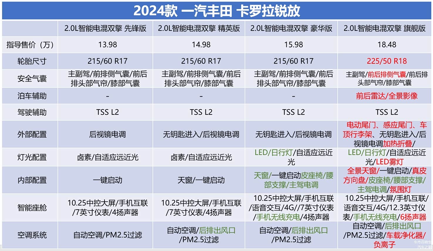 在中高配车型上,锐放的配置也很有针对性,精英版相比先锋版多出了天窗、后排出风口以及前排无钥匙进入;豪华版又比精英版多出了LED大灯、车联网、手机无线充电、皮座椅、腰部支撑、主驾电调,这1万元的差价提升非常大;而顶配旗舰版相比豪华版又多出了,18英寸轮毂、后排气囊、360度全景影像、电动尾门、车顶行李架、全景天窗、后视镜加热折叠、真皮方向盘、12.3英寸仪表、6扬声器、氛围灯、空气净化,虽然提升同样很大,但差价也足足来到了2.5万元,这其中的取舍就要消费者自己衡量了。