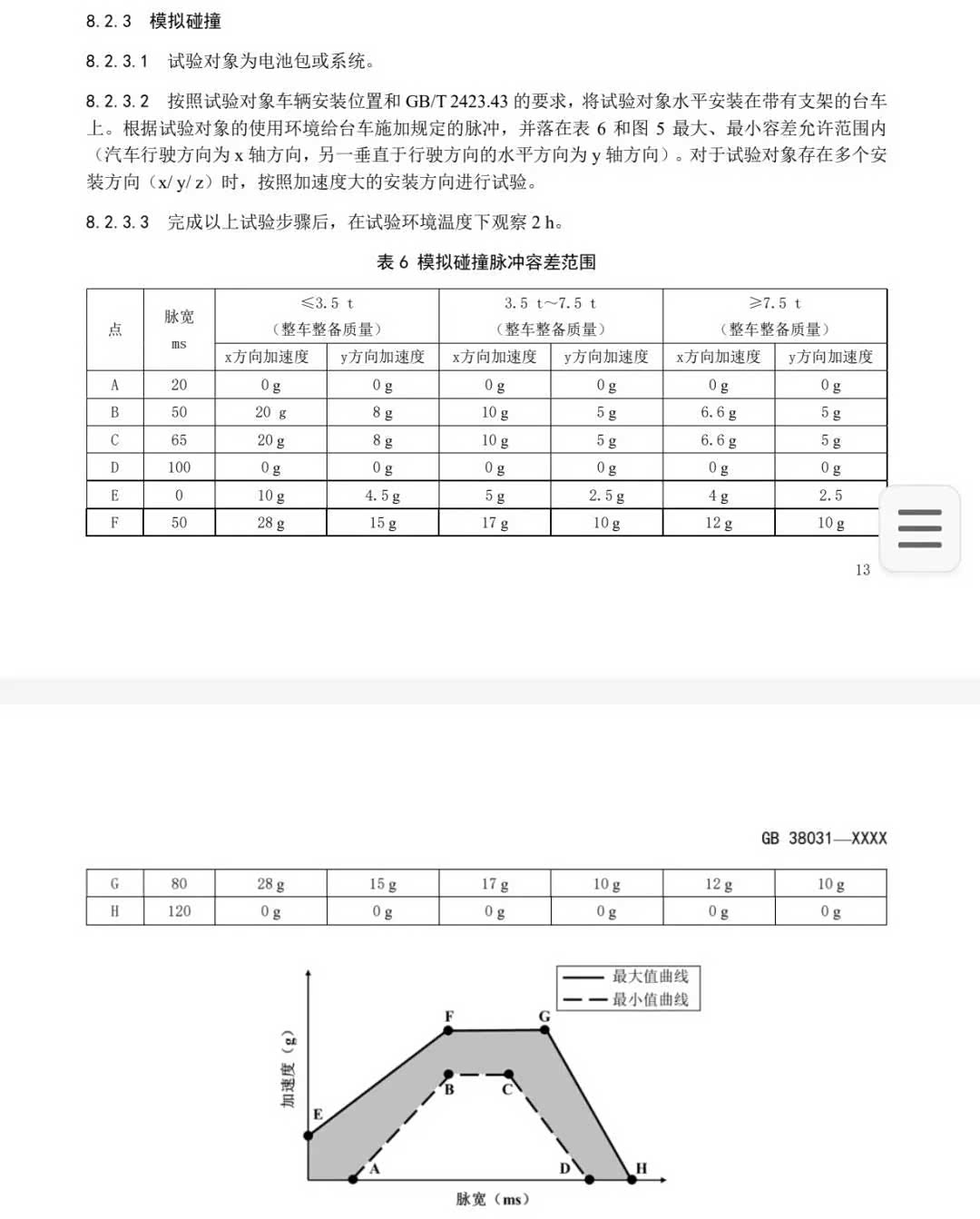 其次,这是测试情况下不起火,而不是任何情况下不起火。实际情况不能完全参考测试情况。举个例子,上图为国标电池碰撞测试的加速度要求,按照最严格的方式计算,X向最快的速度不到50km/h,Y向为26km/h。类似之前大众100时速和小米90时速的碰撞后起火,按照新规的定义,并不能说这两台车的电池不合格。