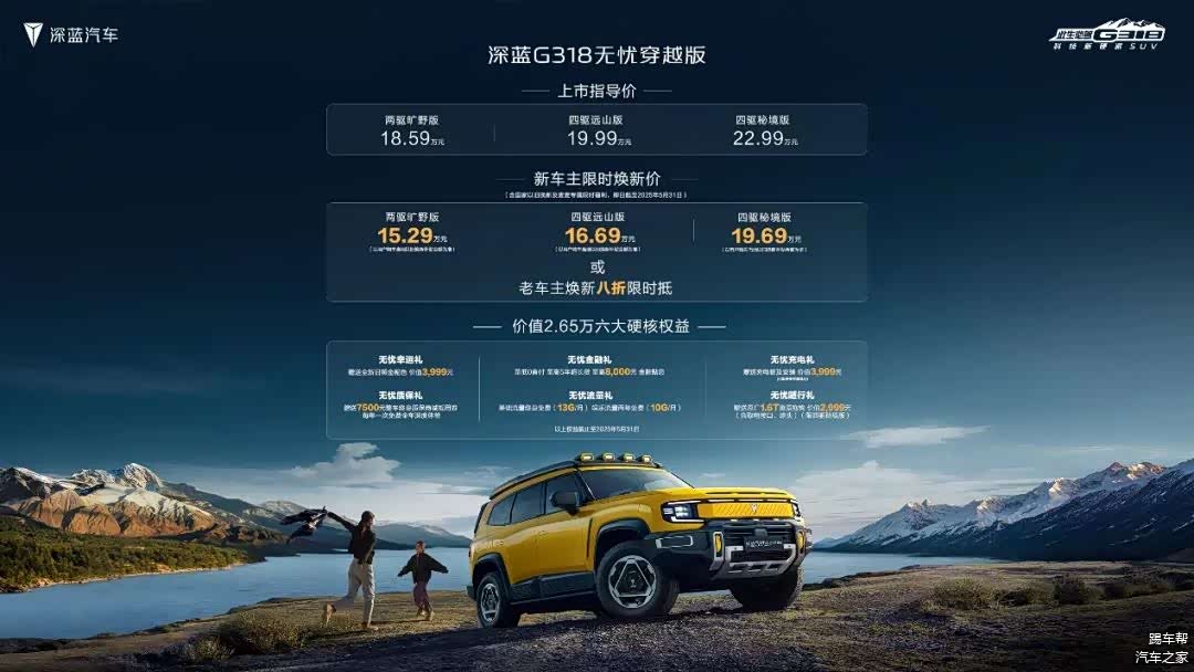 4月18日,深蓝G318无忧穿越版正式在重庆上市,推出两驱旷野版、四驱远山版、四驱秘境版三款车型,售价区间为15.29万元至19.69万元。