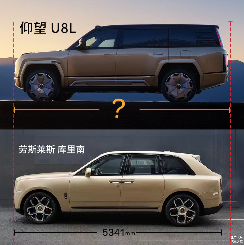 相比之下仰望U8L就更务实了,不但取消了小书包备胎,而且还增加了车身长度。从官方公开的对比图来看,仰望U8L的车身长度比劳斯莱斯裤里难还要长一截,估计要达到5.5米了,比“以大为美”的理想mega还大。