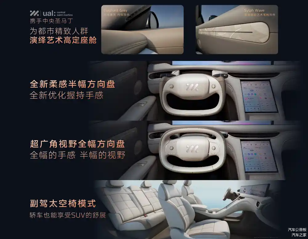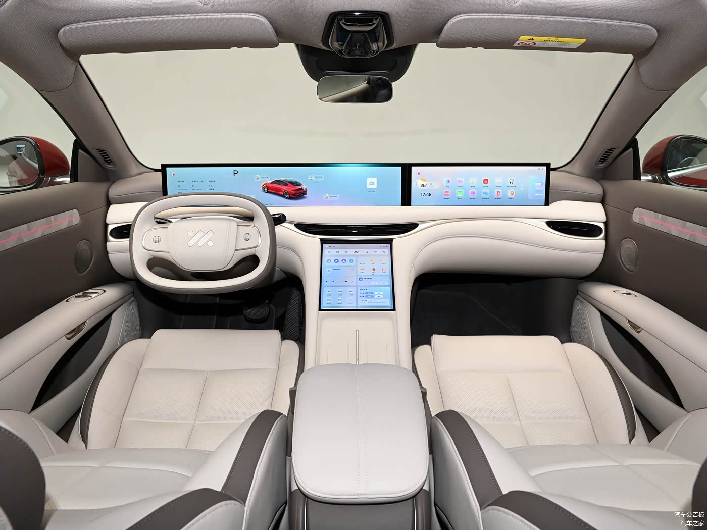 车内同样是我们熟悉的设计,整个内饰几乎都是屏幕,科技感毋庸置疑,只是笔者觉得这样的设计就是为了大屏而大屏。当然,新车也有变化,首先就是方向盘取消了半辐设计,转而变成了椭圆形全辐设计,这样的设计肯定比半辐更实用。另外,新车还定制了全新的丝绒轻羽木纹饰板,视觉观感也会更强。