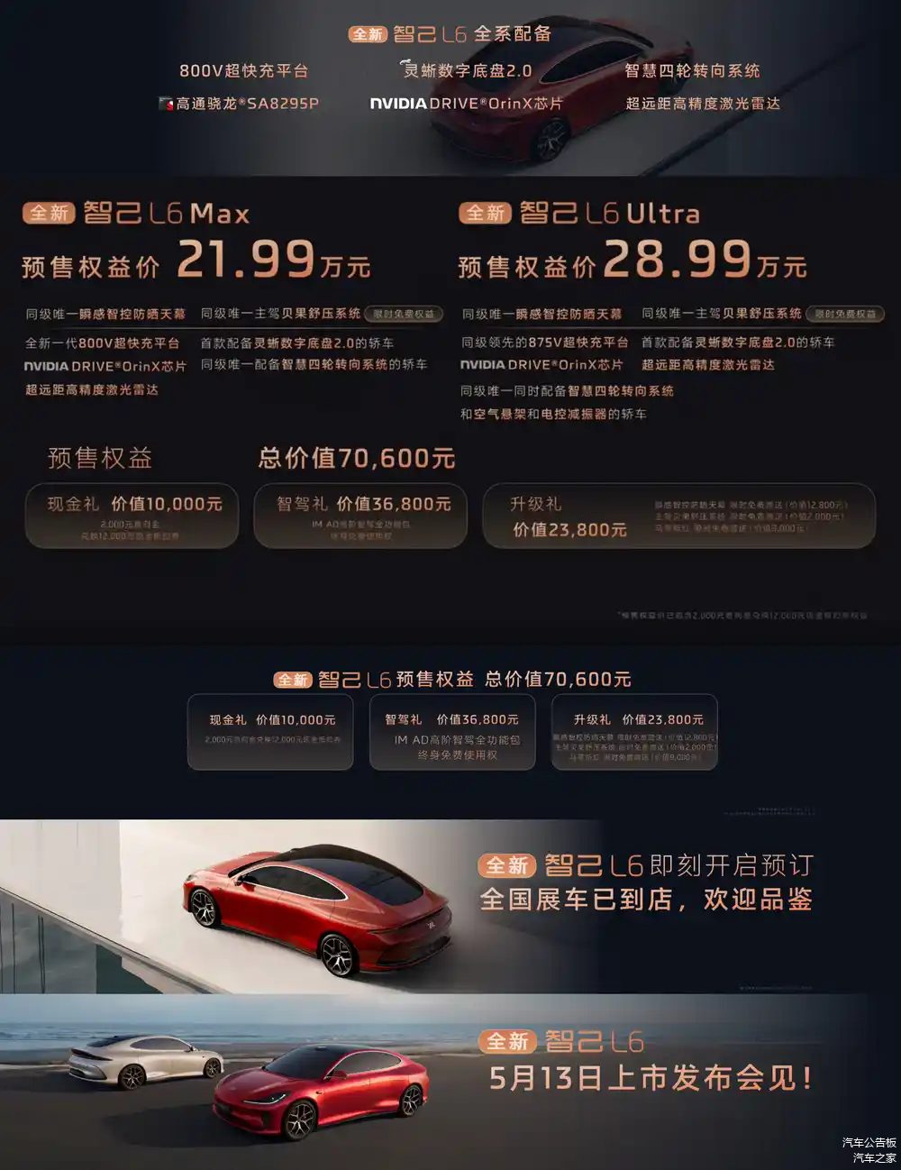 4月18日,新款 智己L6(图片 | 参数 | 询价)开启全国预售,该车的预售权益价为21.99-28.99万元,而预售价为22.99-29.99万元,将于5月13日上市。值得一提的是,本次新车的配置非常多,比如全系标配800V高压平台、激光雷达、“灵蜥数字底盘”和智慧四轮转向系统等,看点不可谓不多。