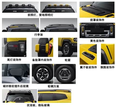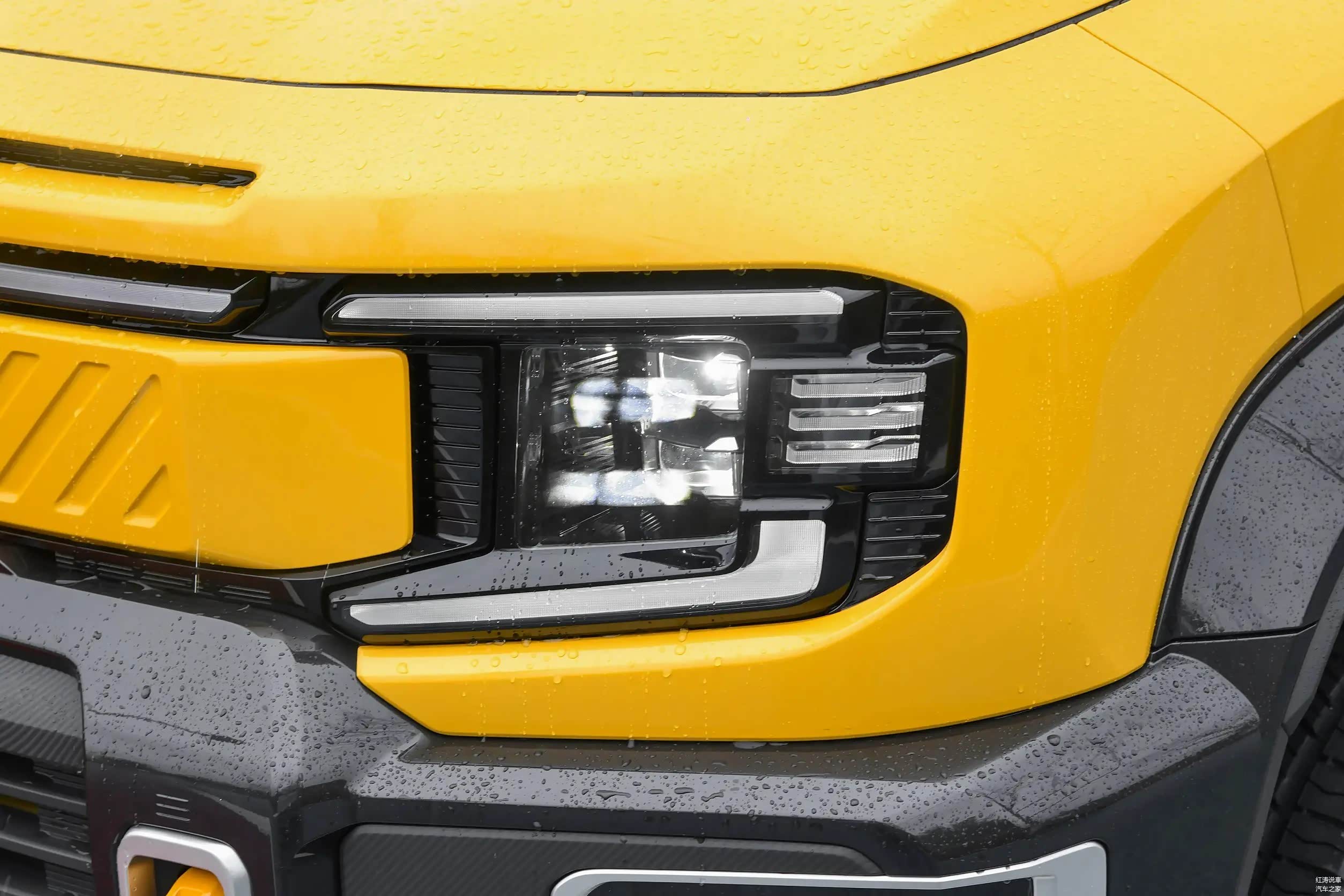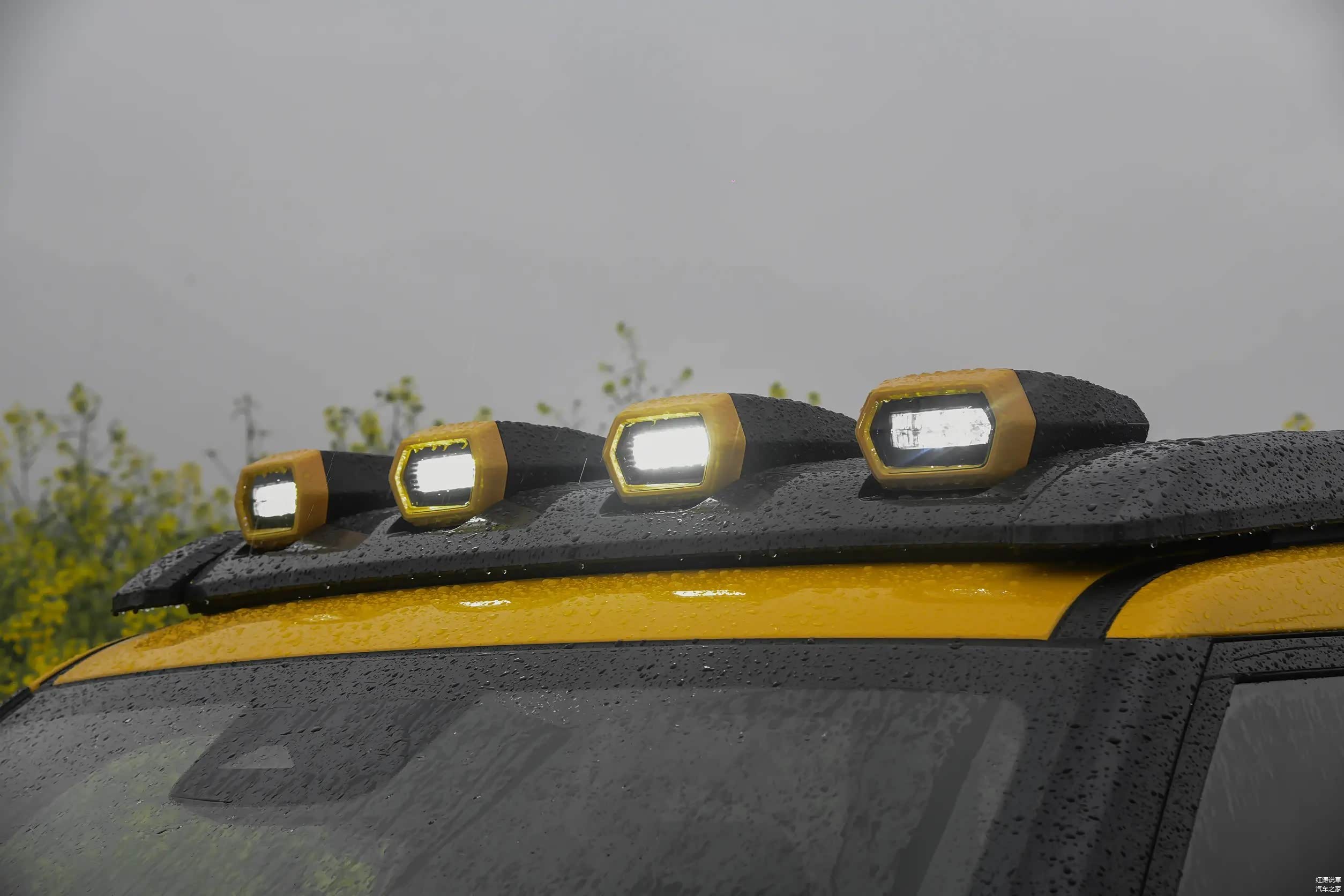 深蓝G318无忧穿越版在车顶位置配有阵列式射灯和车顶平台,车顶的远光灯分为2个远光辅助灯和2个露营照明灯,车顶远光灯可以在行驶中开启且符合法规要求。