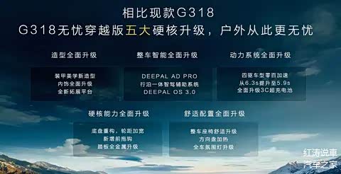 结语:深蓝G318无忧穿越版是带有电气化背景的越野属性SUV,方盒子外观很霸气,配置更丰富,空间、动力、续航以及通过性等方面都能让人满意,从级别定位来看,该车面对的选手有方程豹豹5、坦克400 Hi4-T等,那么你觉得深蓝G318无忧穿越版能火吗?欢迎留言讨论。