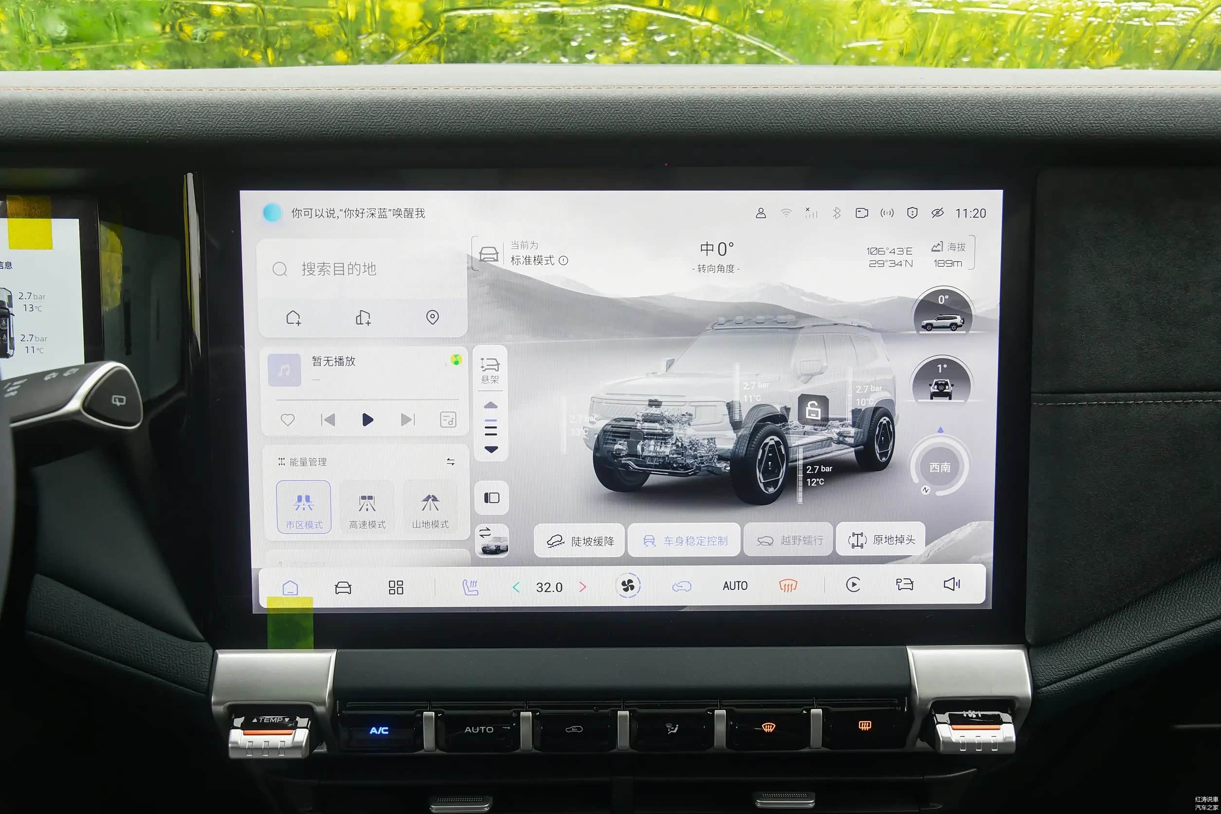 深蓝G318无忧穿越版的内饰延续现款车型的设计,副驾手套箱位置提供可支撑3公斤的挂钩,10.25英寸液晶仪表和14.6英寸中控屏可以显示丰富的车辆信息和娱乐内容,车机支持语音四区域唤醒识别、语音连续识别、可见即可说、多指飞屏等,并且智驾系统做了升级,拥有辅助变道、信号灯识别、智能泊车等多种功能,舒适性配置也有所提升。
