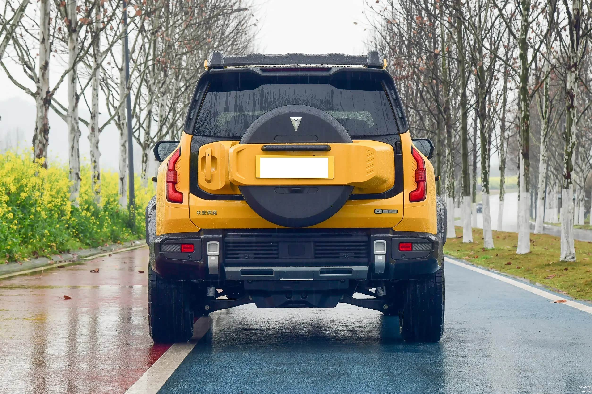 深蓝G318无忧穿越版的车身造型展现出阳刚硬派之美,配备隐藏式电动门把手、固定脚踏板,前翼子板处增加了黑色饰条,侧裙位置带有“G318”标识,采用全新样式的轮毂,匹配大陆品牌AT全地形轮胎,侧开式尾门、外挂式备胎等元素都使其更具野性,并且红色尾灯很有特点。