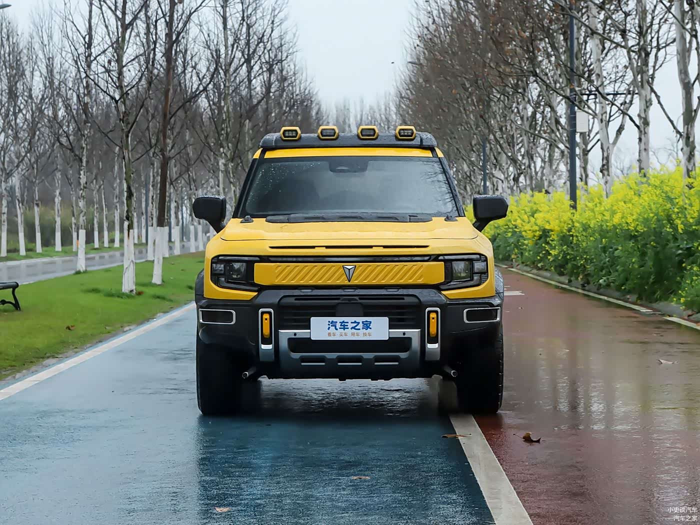 我们首先来看新车的外观设计方面,其设计团队大胆采用"星际战舰"设计语言,将未来科技感与传统硬派越野元素完美融合。前脸部分,封闭式格栅设计彰显其新能源身份,细长的LED灯带配合两侧矩阵式LED大灯组,形成了贯穿式的造型来提升视觉宽度,机盖下方的进气口,结合底部粗壮的熏黑前包围以及银色金属饰板镶嵌,营造出不怒自威的气场。而车头特别值得一提的是可编程交互灯语功能,用户可通过自定义灯光秀实现人车互动,这项配置在同级硬派SUV中实属罕见。可以看到在车顶位置配备有阵列式射灯以及车顶平台,可以提升车辆在户外场景下的实用性。根据官方信息,该车配备的车顶远光灯分为2个远光辅助灯和2个露营照明灯,车顶远光灯可在行驶中开启且符合法规要求,这也是一辆硬派越野SUV最为实用的灯光。