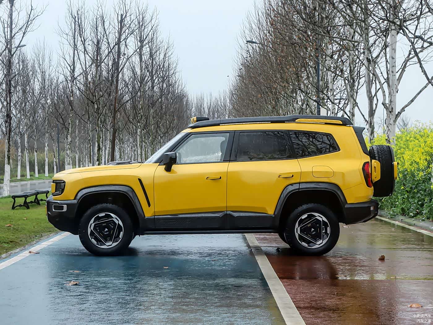 再来看车身侧面部分,车身的线条堪称教科书级的硬派设计,平直的车顶线条保障了车内空间利用率,而且突出厚重的熏黑行李架造型饱满,起伏有致的造型还能够提升车身的厚重感,车窗部分的面积很大,并且熏黑的A柱还形成了悬浮式车顶造型,车门部分的腰线为突出的棱角造型,而外扩的轮眉与隐藏式门把手则形成了刚柔并济的视觉效果,层次感表现不错,并且在C柱后方的独特拐角设计不仅提升了辨识度,更优化了后排乘客的头部空间。