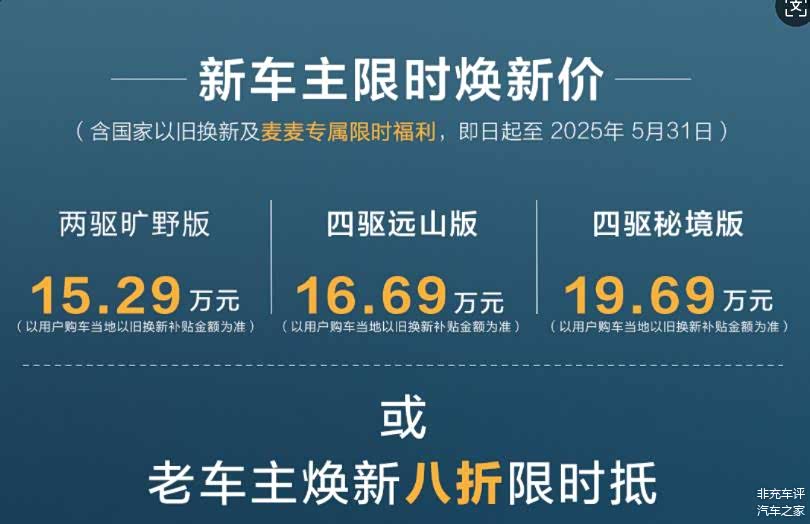 关键看价格和政策:目前是限时活动价(到2025年5月31日),算上各种补贴后,两驱15.29万,四驱16.69万和19.69万。