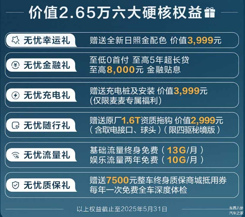 另外,还有个总价值2.65万的“六大硬核权益”大礼包,包括什么金融贴息、送充电桩、送流量、送拖挂资质(这个是四驱秘境版专属)、还有终身质保抵用券和每年一次免费体检。