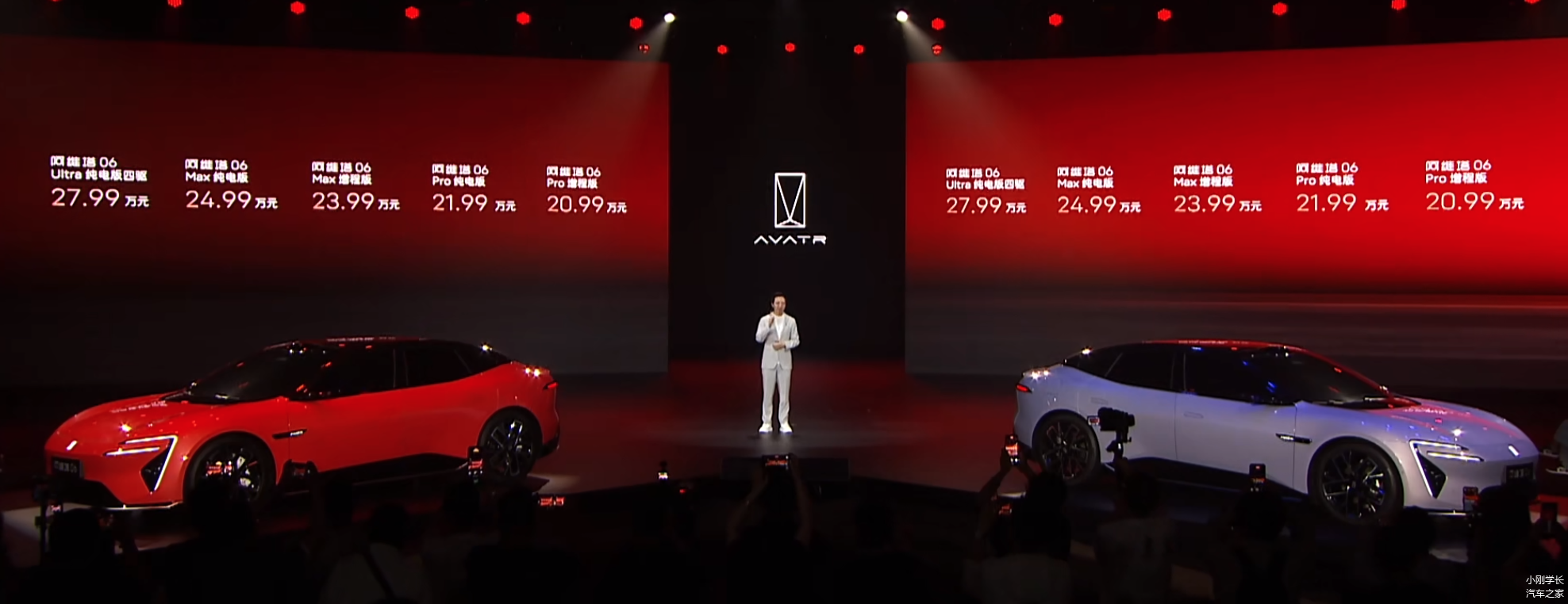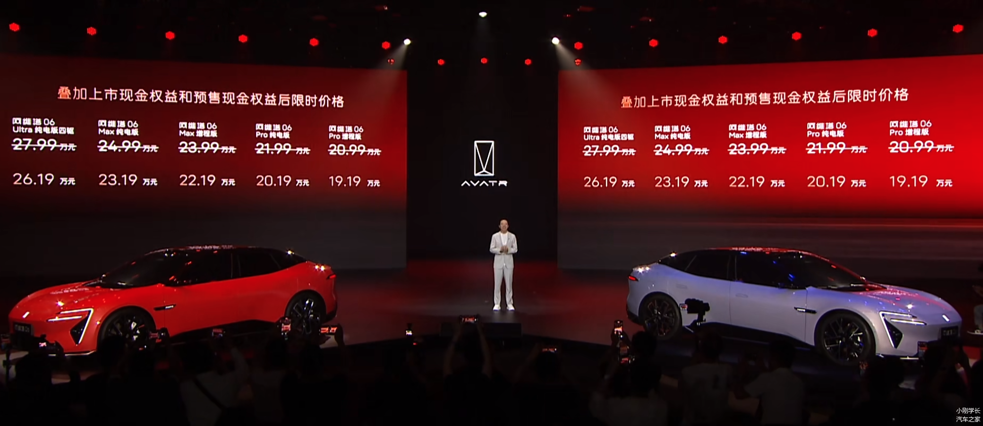 4月19号, 阿维塔06(图片 | 参数 | 询价)正式上市,售价为20.99-27.99万元,权益价19.19-26.19万元,提供5款车型,两款增程三款纯电,阿维塔06为阿维塔旗下第四款车型,定位中型轿车,搭载华为乾崑智驾系统,提供增程和纯电双动力,纯电版为全域800V平台。