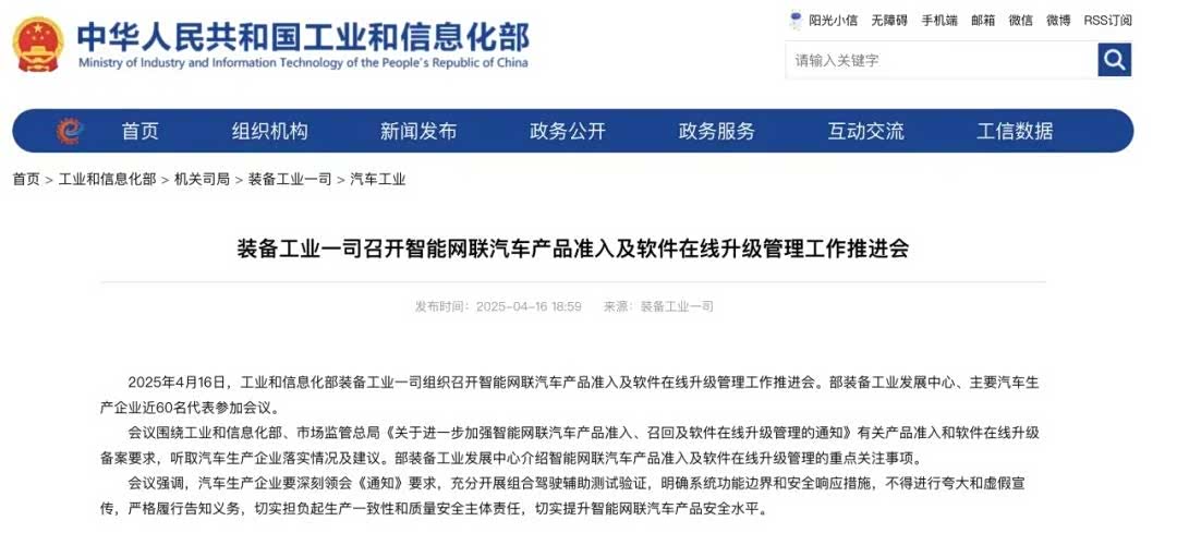 4月16日,工信部组织召开智能网联汽车产品准入及软件在线升级管理工作推进会,主要汽车生产企业近60名代表参加会议,重点讨论关于车企OTA升级备案和驾驶辅助功能测试的内容。