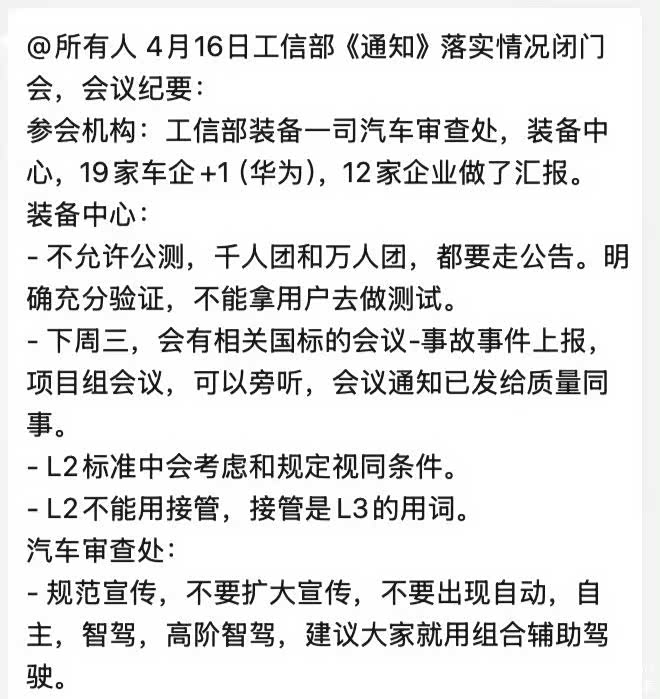 同时,根据一份流传出的会议纪要显示,车企在智驾相关的宣传中将面临更为严苛的规定。