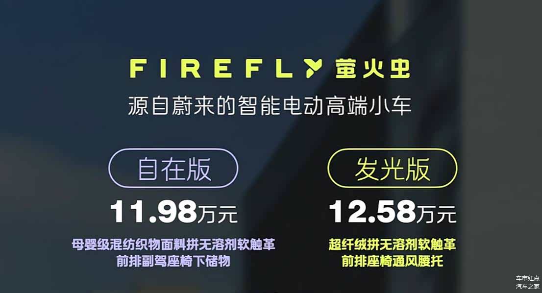 4月19日, firefly萤火虫(图片 | 参数 | 询价)正式上市,新车共推出2款车型,售价11.98-12.58万元。firefly萤火虫作为蔚来第三品牌的首款车型,将主打智能电动高端小车市场。