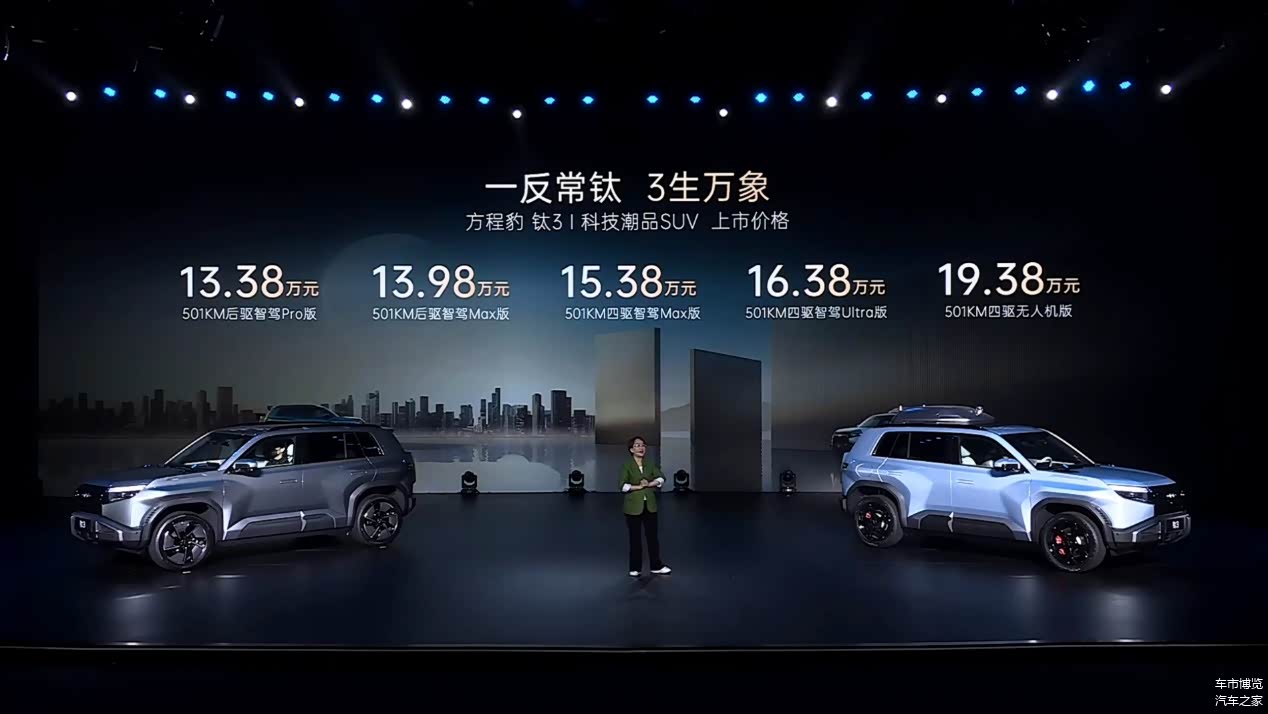 4月16日,中国新能源汽车领军企业比亚迪再次掀起行业波澜,旗下方程豹系列全新车型——“ 钛3(图片 | 参数 | 询价)”正式上市。共计5个版本,售价区间为13.38万元-19.38万元。