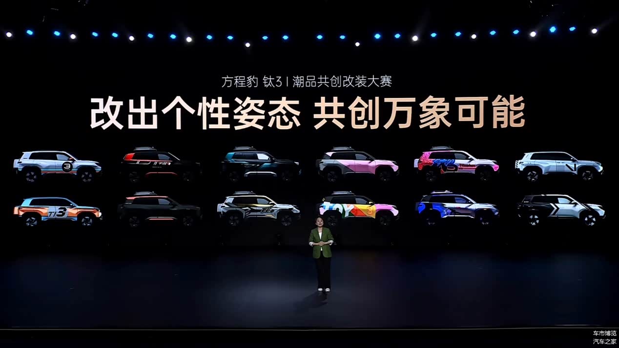 钛3联合多家潮改品牌带来12款联合潮改方案。本次加推量产SUPER 3版潮改方案,也将同步上架官方商城。此外,方程豹宣布4月23日启动《钛3潮改共创大赛》,方程豹官方将投入百万奖金池,助力用户实现潮改梦想!本次大赛设置全民赛道、专业赛道等多个赛道,可关注后续方程豹官方信息。