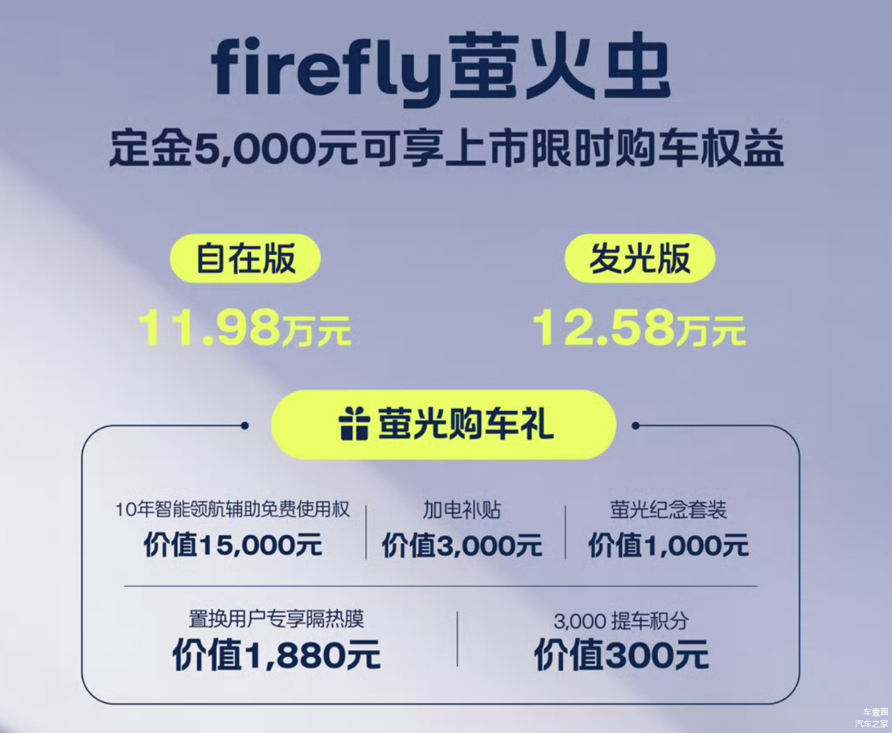 日前,firefly萤火虫正式上市,售价11.98-12.58万元。相较于此前14.88万元的预售价 ,上市起售价又少了近3万元。
