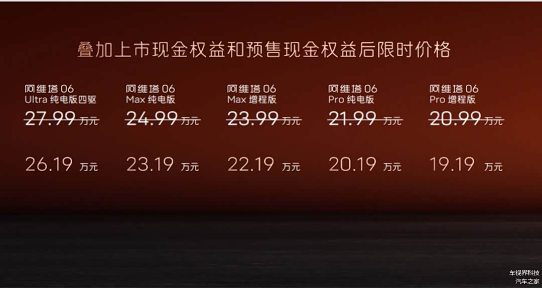 4月19日,阿维塔06正式上市,推出纯电、增程版共计推出5款配置车型,指导价区间为20.99-26.19万元,叠加上市现金权益和预售现金权益后的价格区间为19.19-26.19万元。阿维塔06作为品牌第4款车型,进一步加强了和华为车BU的合作,搭载华为乾崑智驾系统。