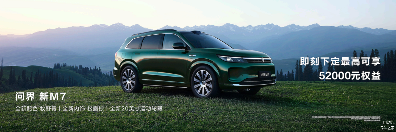 问界 新M7正式推出全新『牧野青』配色,将质感青色融入车身设计,呈现科技与美学交融的视觉盛宴。新车外观延续家族化设计语言,搭配『松露棕』内饰与全新20英寸十辐运动轮毂,兼具高级感与辨识度,进一步满足用户对个性化与品味的追求。